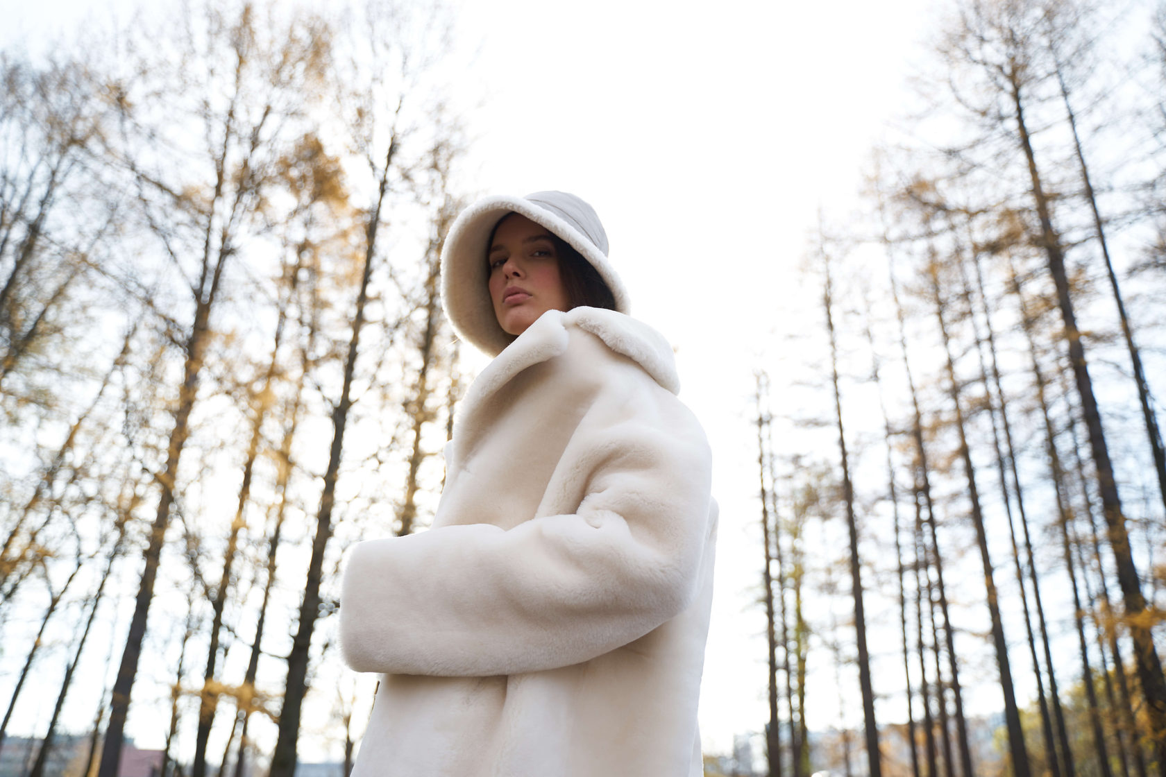 Шуба полностью на подкладке, но подол и рукава оставлены с открытыми срезами, чтобы визуально облегчить силуэт.